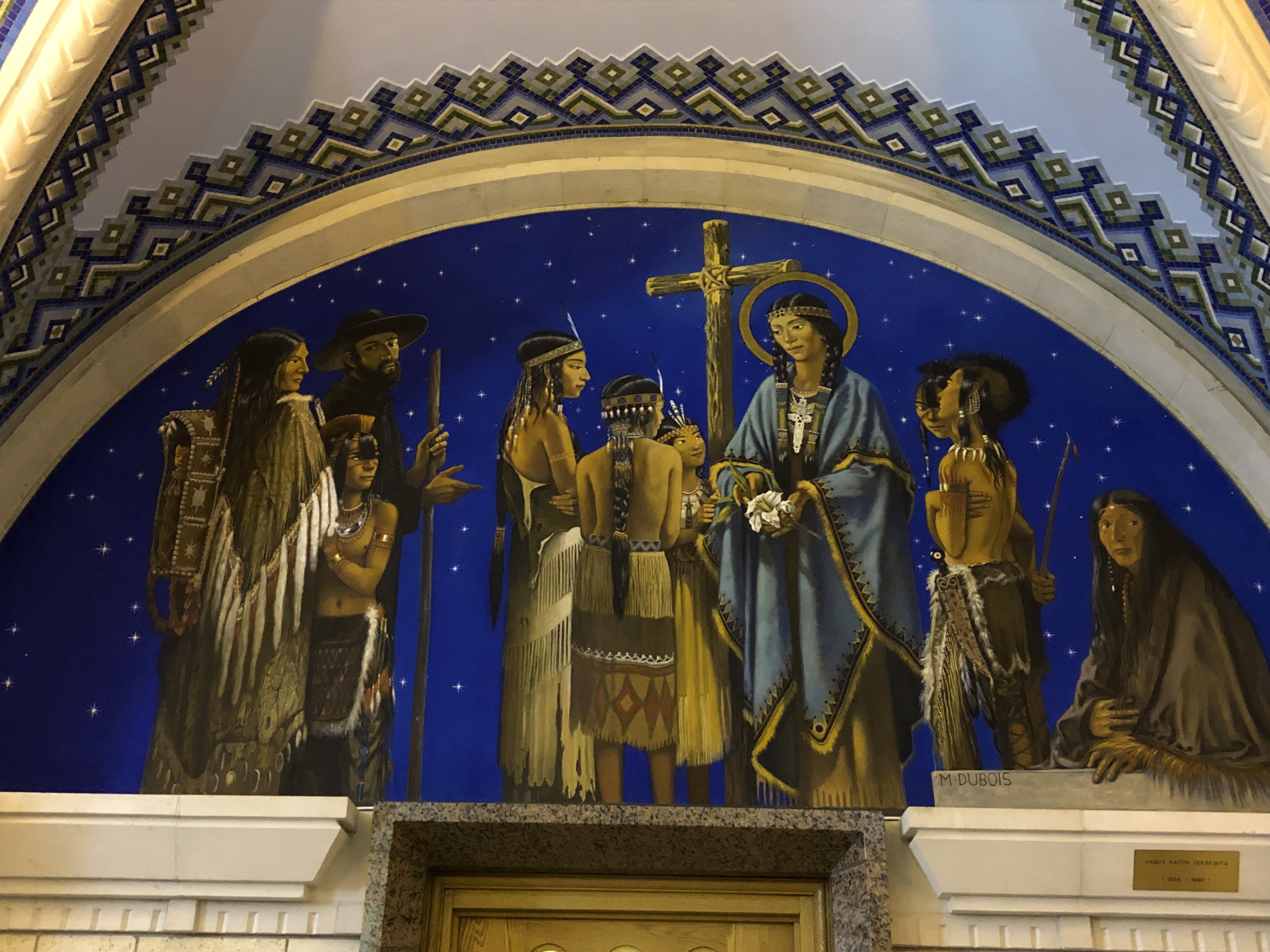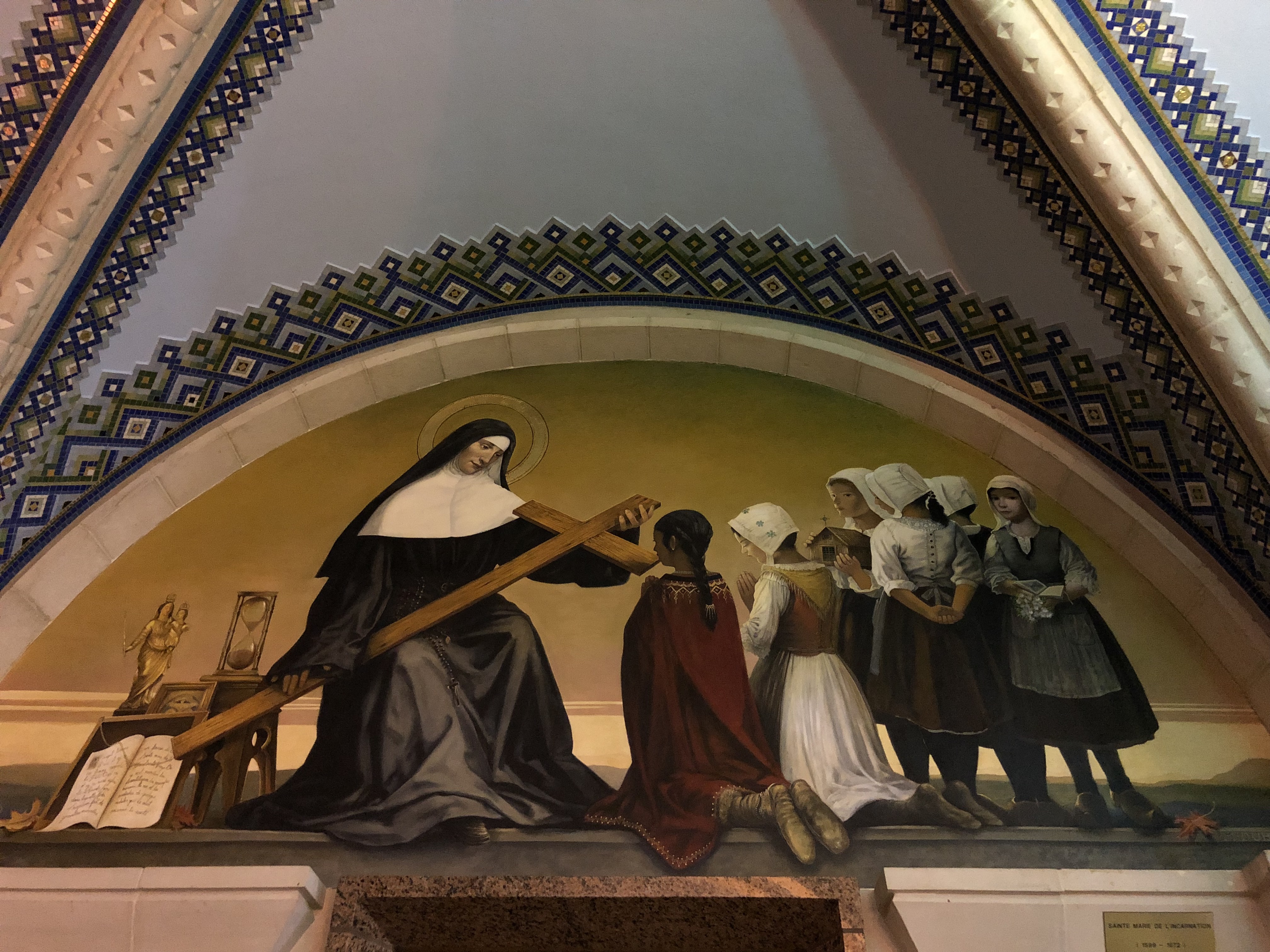 The Immaculate Conception Chapel beneath the main sanctuary features beautiful paintings of the many holy people of New France.