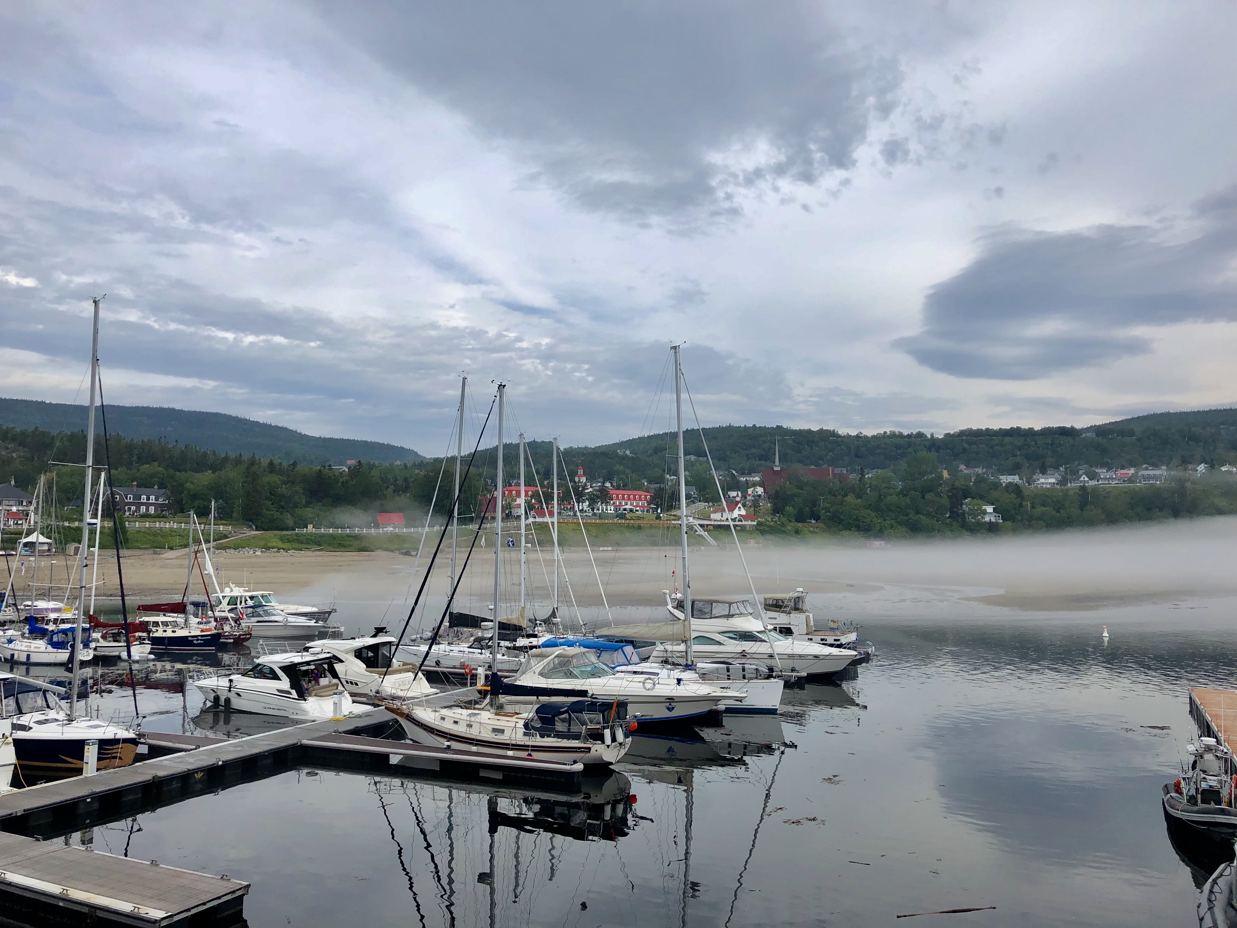 We met le Capitaine Florent for a morning cruise around the foggy fjord. After a briefing about the brackish water flowing from the salty St. Lawrence into the freshwater Saguenay and why whales and seals like to feed there, we were out on the water. In all we saw more than a dozen whales and a bob of seven harbor seals. The lumpy little belugas were especially cute!