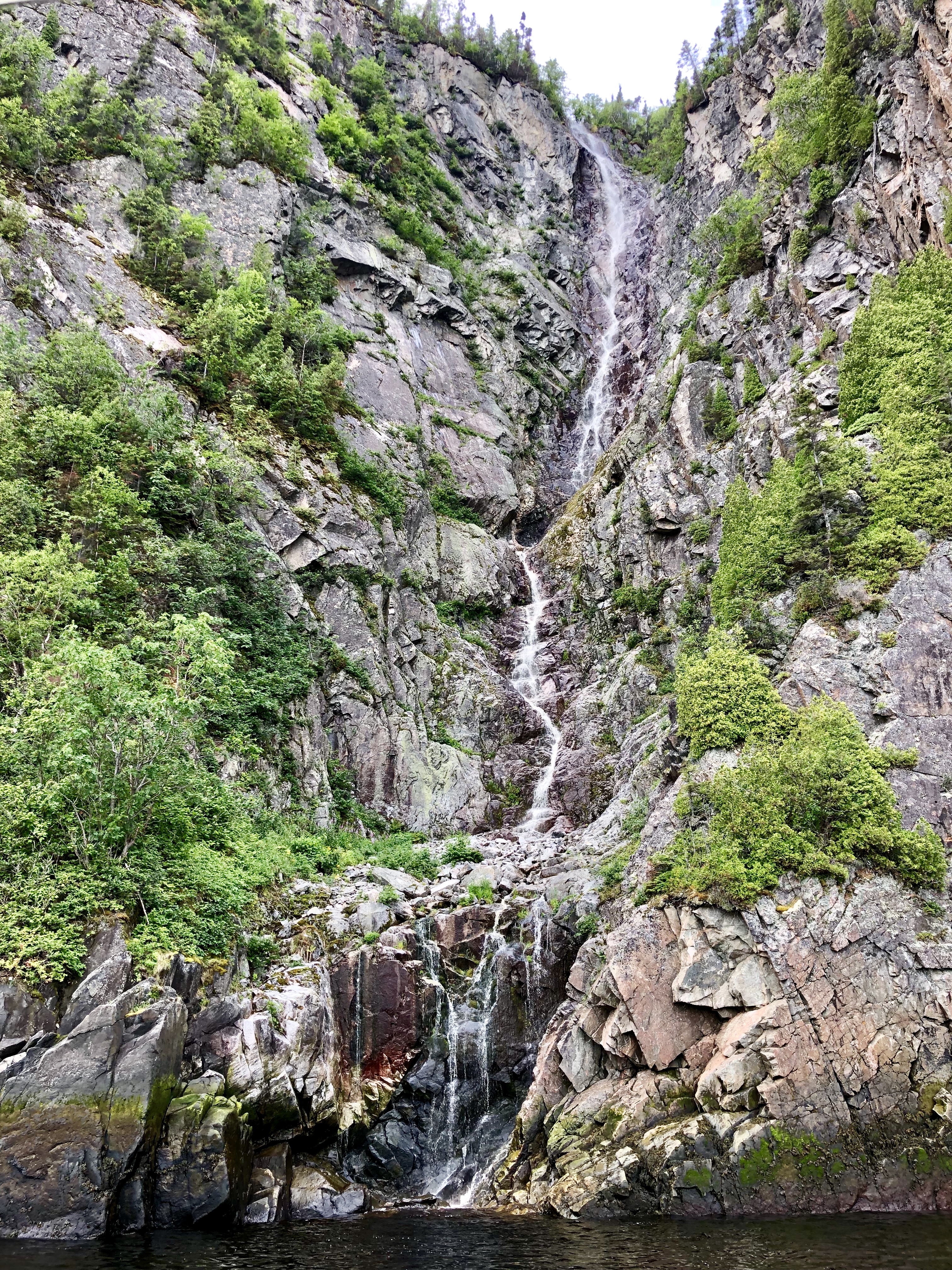 Le Capitaine Florent took us up into the Saguenay fjord to look for a bit and showed us a beautiful waterfall that has a slow trickle. It was larger than usual because of heavy rains when we saw it, but normally it’s a small stream tumbling over a tall ledge. So, the French settlers named it la Chute du Caribou-Qui-Pisse. Translation: waterfall of the caribou that pees.