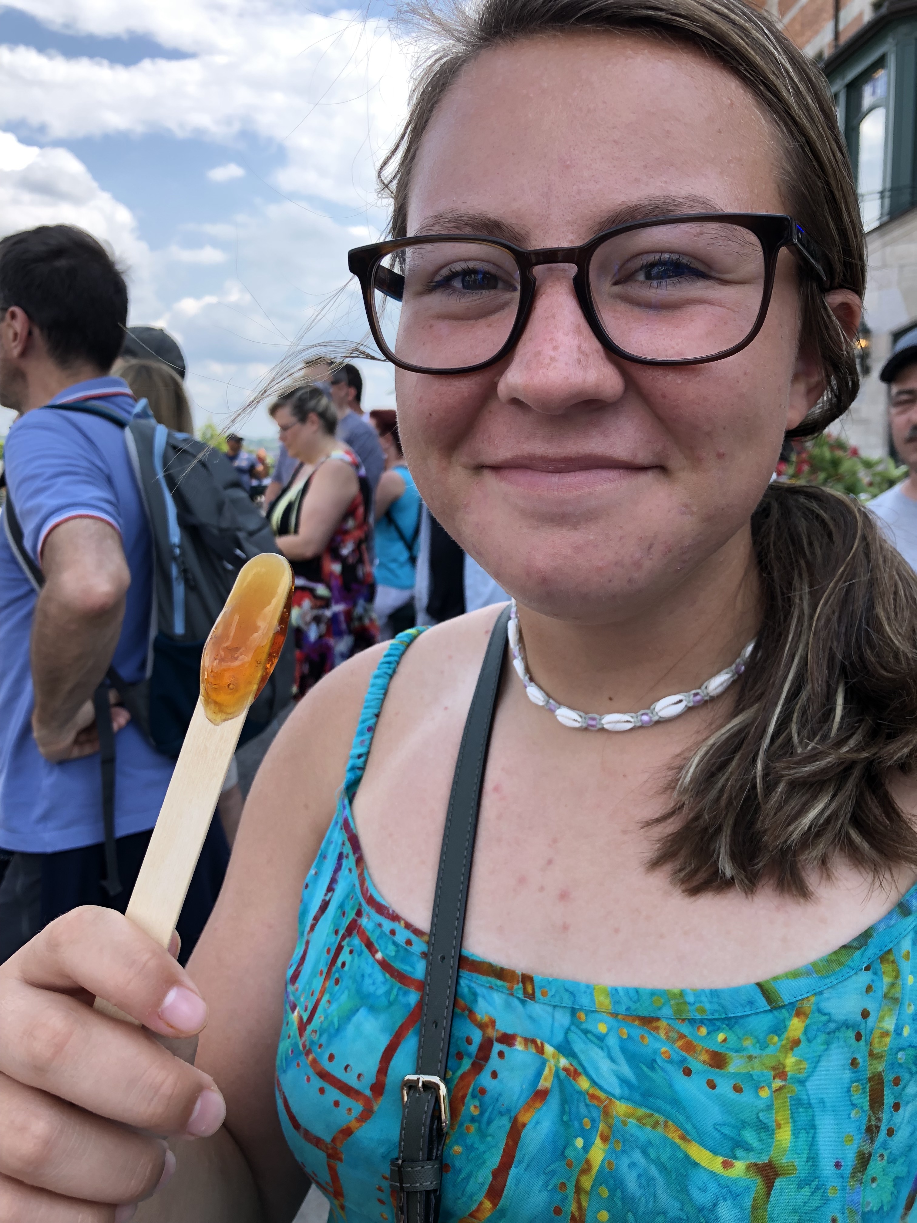 The heat led us to a big trough of ice with a jolly guy in a plaid shirt selling maple taffy. The recipe is easy. Make snow; pour maple syrup over it in a strip. As the syrup starts to harden, roll the taffy onto a stick and eat. SO GOOD!!