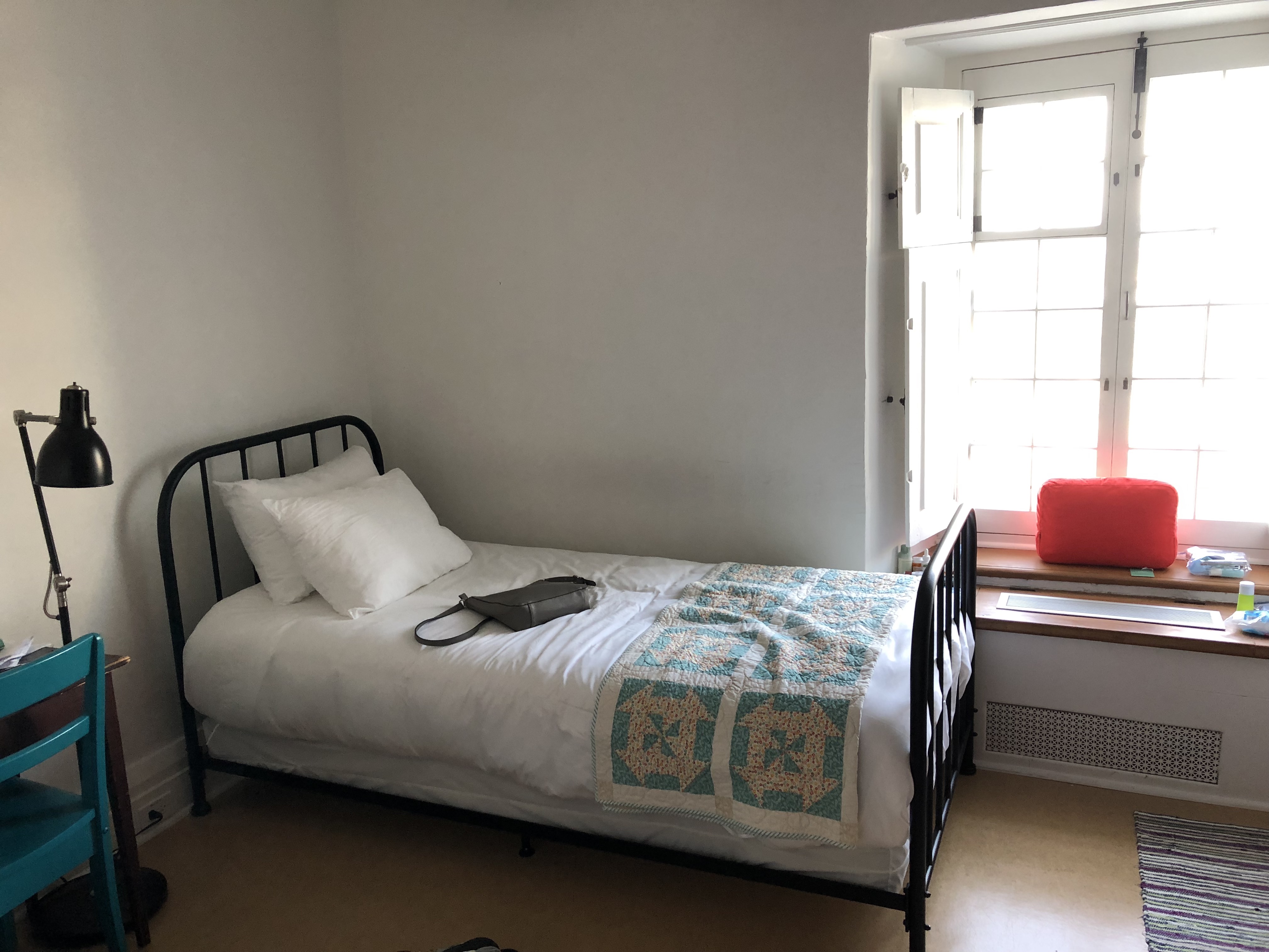 We stayed in a historic room once used as a nuns’ cell, although modern rooms are available and extremely nice. With twin iron beds and a sink, the room is almost Spartan, yet comfortable. (The bathroom is down the hall!) Light-filled, without TV and with a little knitted pouch for cell phones to encourage detachment from them, the room is made for rest. And we slept well and peacefully under our patchwork quilts.