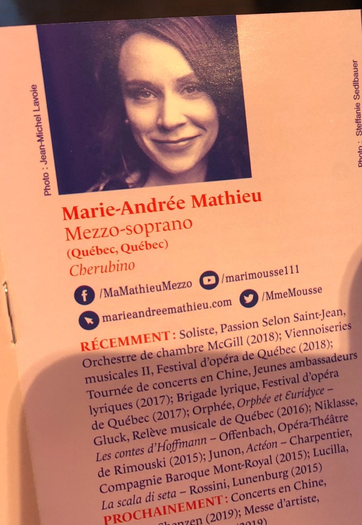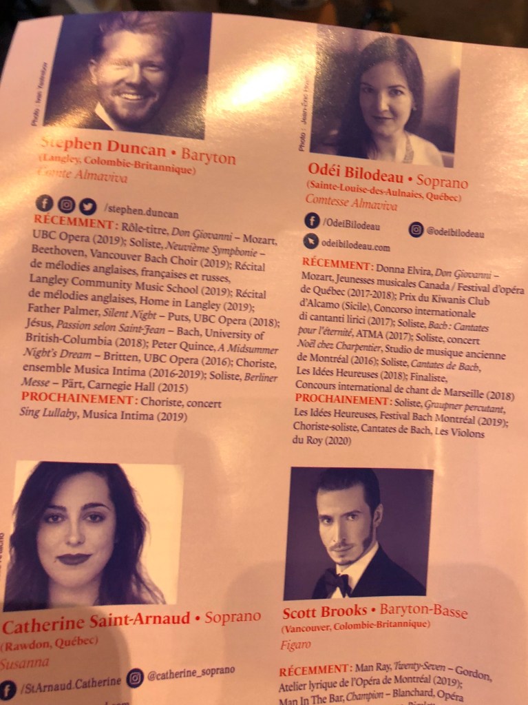Off to the opera! We decided to see a show in the Opera Festival of Quebec — The Marriage of Figaro by Mozart, performed at the Théâtre la Bordée. (The theater was about a twenty minute walk from our hotel. Catch a cab if you don’t enjoy walking that far in your fancy shoes.)
